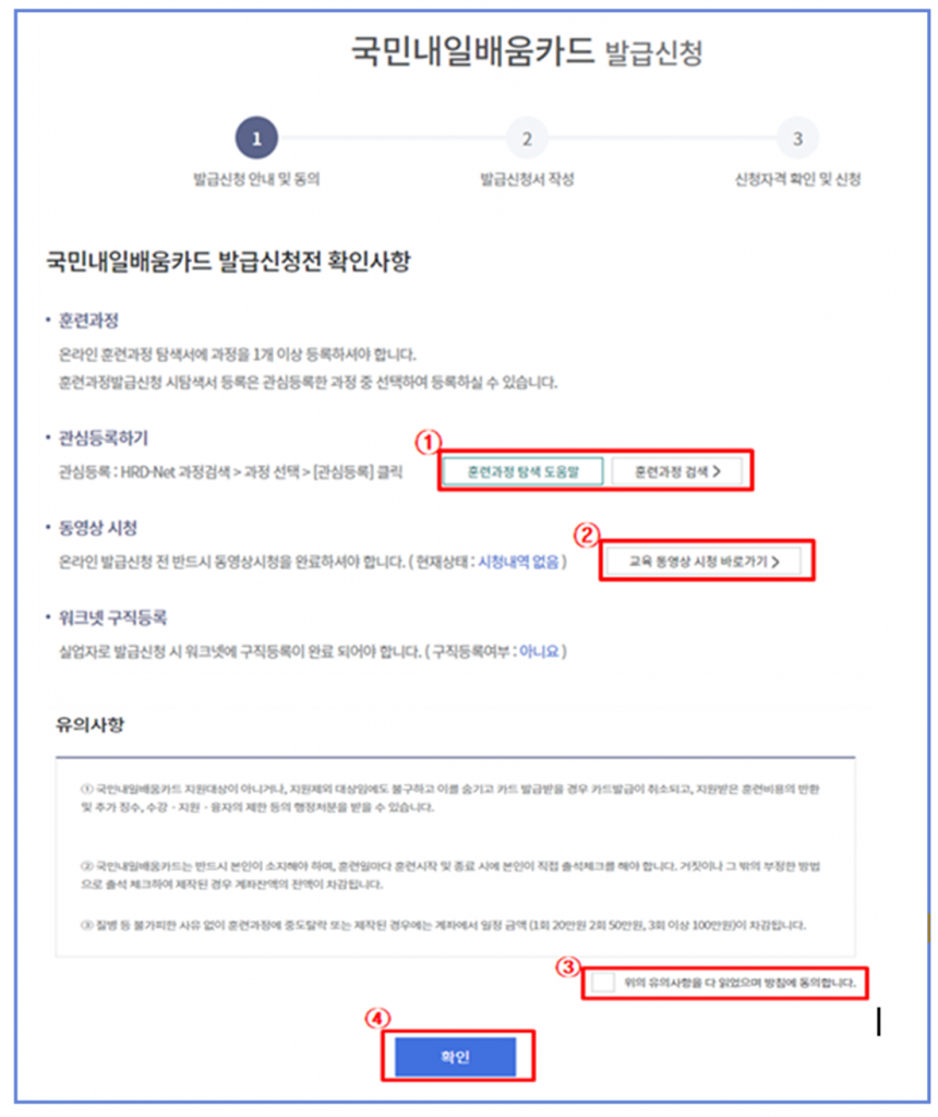 세번째, 발급 신청 전에는 훈련 과정 검색 후 관심있는 것을 1개 이상 등록해야 하며, 동영상 시청도 필요합니다. 이후 개인 정보 입력 화면으로 넘어가며, NH나 신한카드 중에서 선택할 수 있습니다. 카드는 체크/ 신용카드 모두 가능하며, 훈련 과정 등록이 필요합니다.