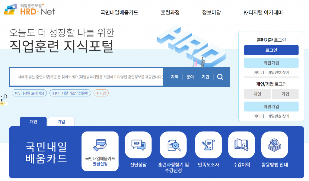 첫번째, HDR-NET 사이트에 접속해 개인 회원으로 가입해야합니다. https://www.hrd.go.kr/hrdp/ma/pmmao/newIndexRenewal.do