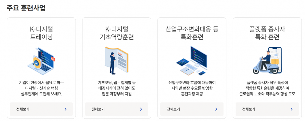 홈페이지나 모바일을 통해 국민내일배움카드 발급 신청, 훈련과정 신청 등을 할 수 있으니 능력을 개발하고 싶다면 찾아보는 것을 추천합니다.