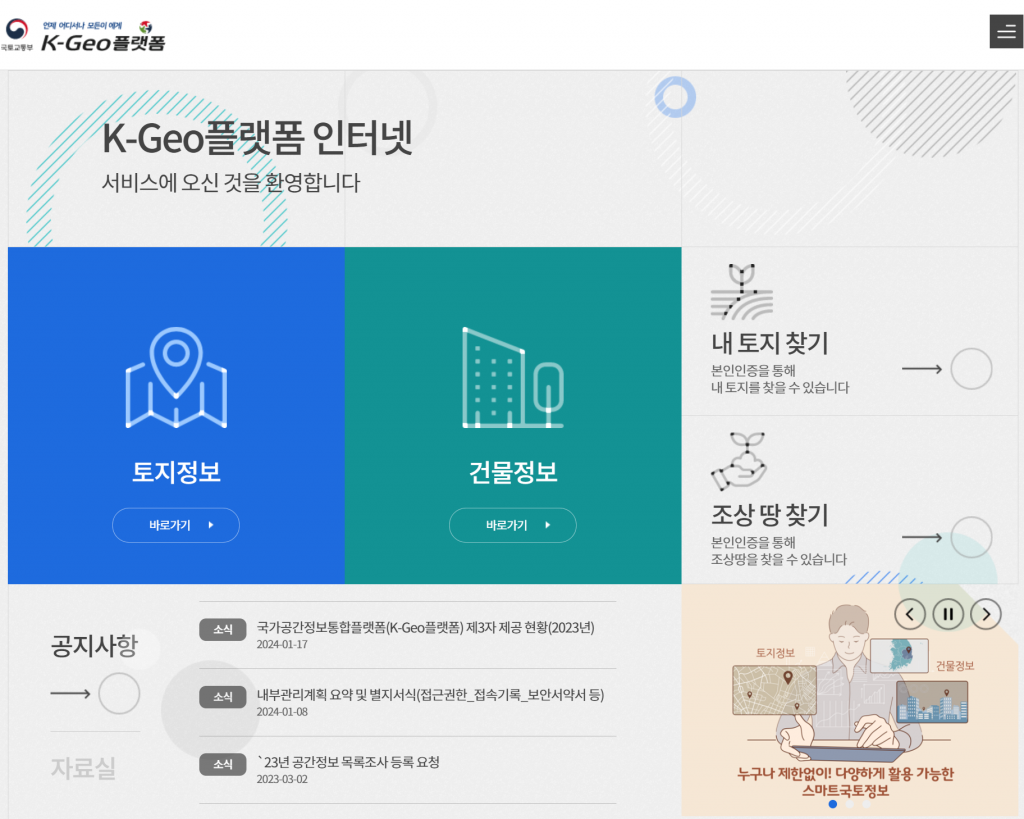 | 스마트 국토정보 PC 홈페이지(K-Geo플랫폼) (0) | 2024.01.30 |