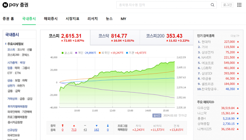 예전에는 Naver 금융 홈에서 국내외 증시 정보를 제공했으나 이제는 네이버 페이 증권에서 관련 정보를 제공하고 있습니다.