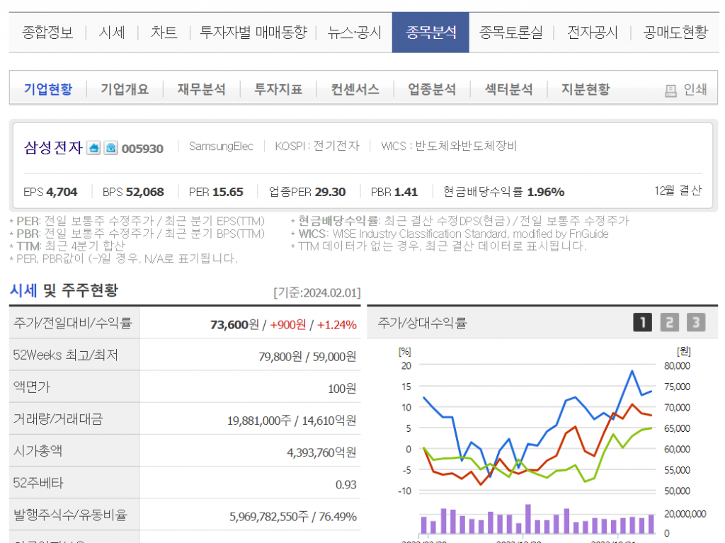 삼성전자를 검색하여 클릭하면, 위와 같은 화면을 볼 수 있습니다. 종합 정보부터 시세, 차트 투자자별 매매 동향, 관련 뉴스, 종목 분석, 공매도 현황 등을 알 수 있습니다. 최근에는 주가가 상승하고 있네요. 다행입니다.