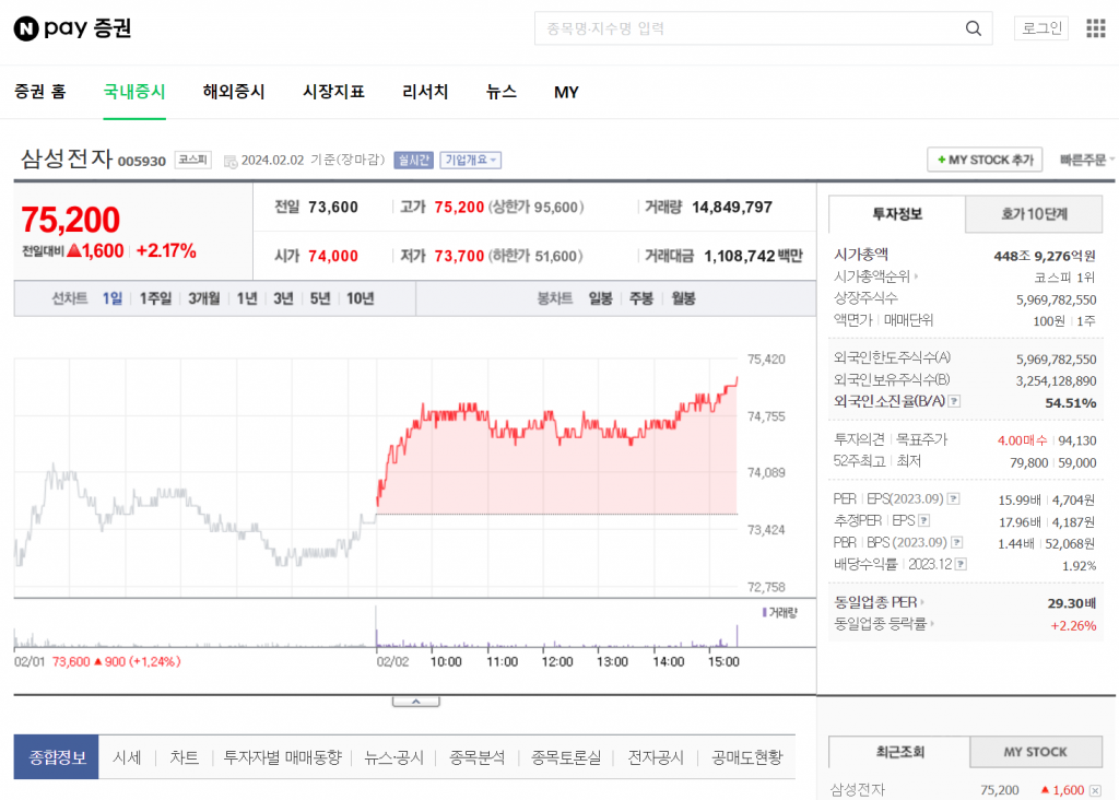 삼성전자를 검색하여 클릭하면, 위와 같은 화면을 볼 수 있습니다. 종합 정보부터 시세, 차트 투자자별 매매 동향, 관련 뉴스, 종목 분석, 공매도 현황 등을 알 수 있습니다. 최근에는 주가가 상승하고 있네요. 다행입니다.