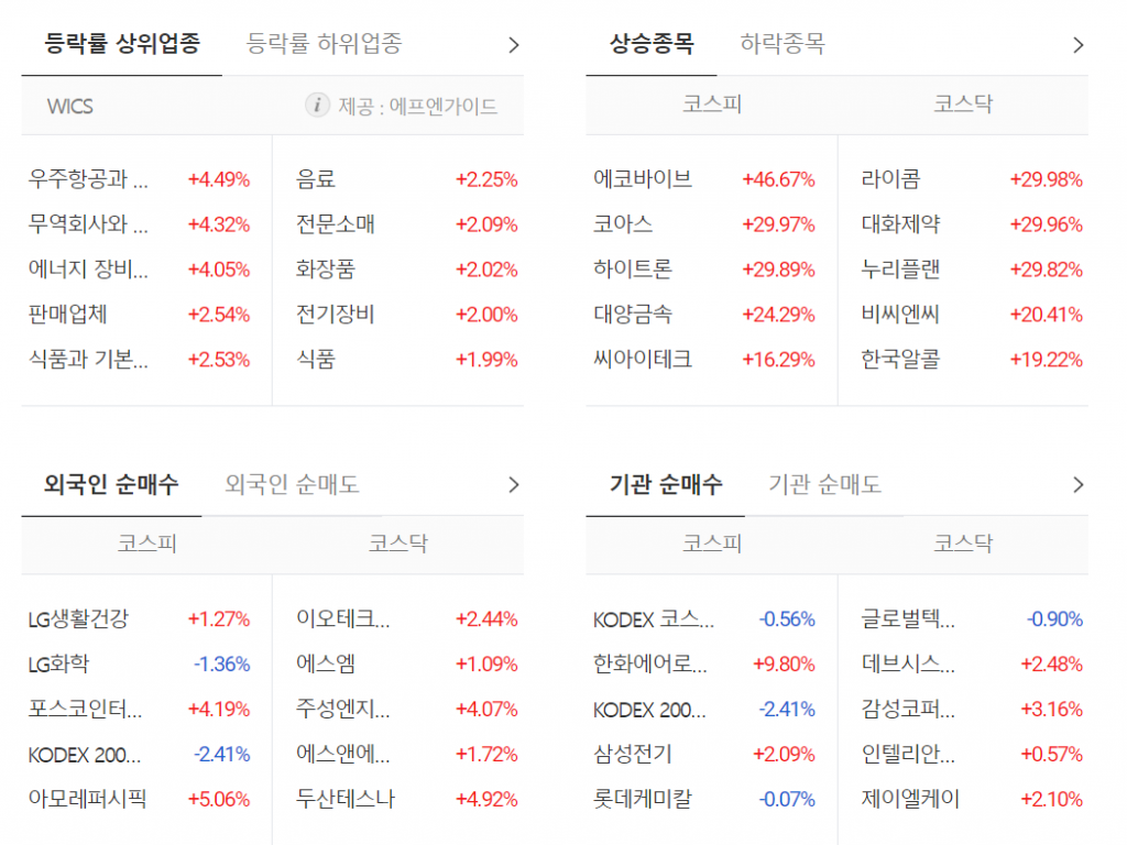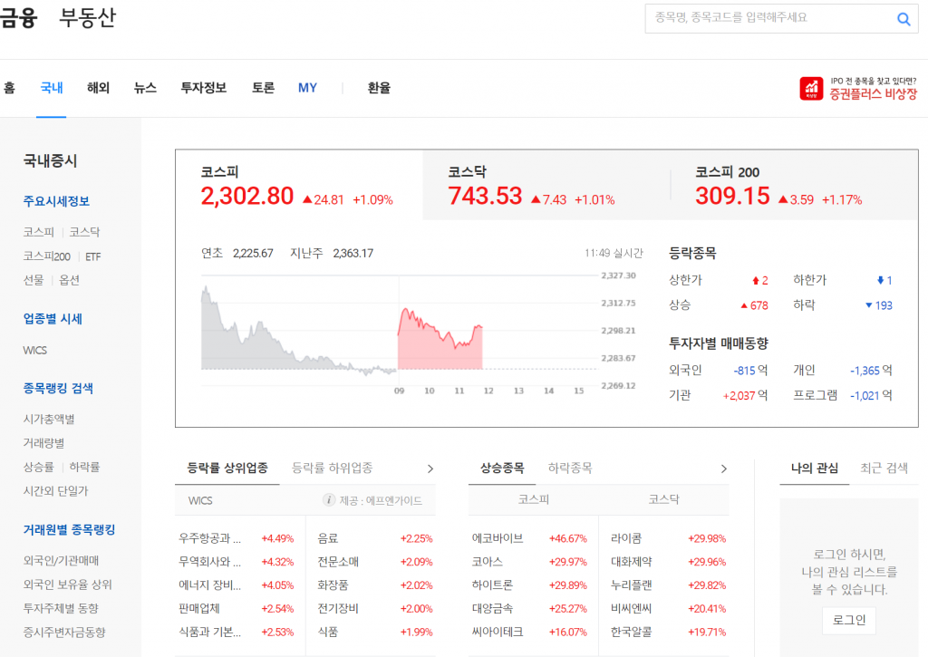 이 페이지에서는 주요한 종합 지수를 빠르게 확인할 수 있습니다. 코스피 지수, 코스닥 지수 및 코스피 200 지수가 포함되어 있으며, 어제와 오늘의 지수 변화를 쉽게 파악할 수 있습니다. 이를 통해 오늘의 시장 분위기를 빠르게 파악할 수 있습니다.