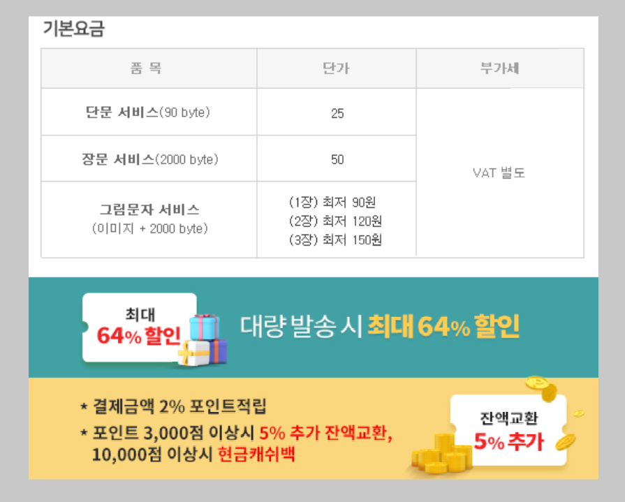 이곳의 요금 체계를 간단히 설명하자면 어렵습니다. 왜냐하면 선 구매를 할 경우에는 매우 저렴해지기 때문입니다. 단문 서비스는 25원, 장문 서비스는 50원입니다. 그러나 포인트 적립과 대량 발송 시 할인 혜택이 있으므로 단문 25원은 최대 가격이라고 볼 수 있습니다.