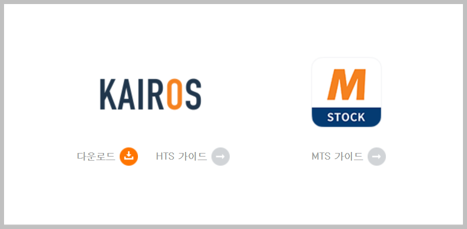 또는 스크롤 해서 내려가면 위와 같은 화면을 볼 수 있습니다. 이곳에서 'KAIROS' 옆의 '다운로드'를 클릭하면 HTS를 다운로드할 수 있습니다. 미래에셋대우의 HTS(홈 트레이딩 시스템) 중 대표적인 것은 카이로스(KAIROS)이기 때문에 이것을 다운로드 받으면 됩니다. 초기에는 대우증권의 QWAY NEO와 미래에셋증권의 카이로스 두 가지가 있었으나, 현재는 카이로스만 운영 중입니다.