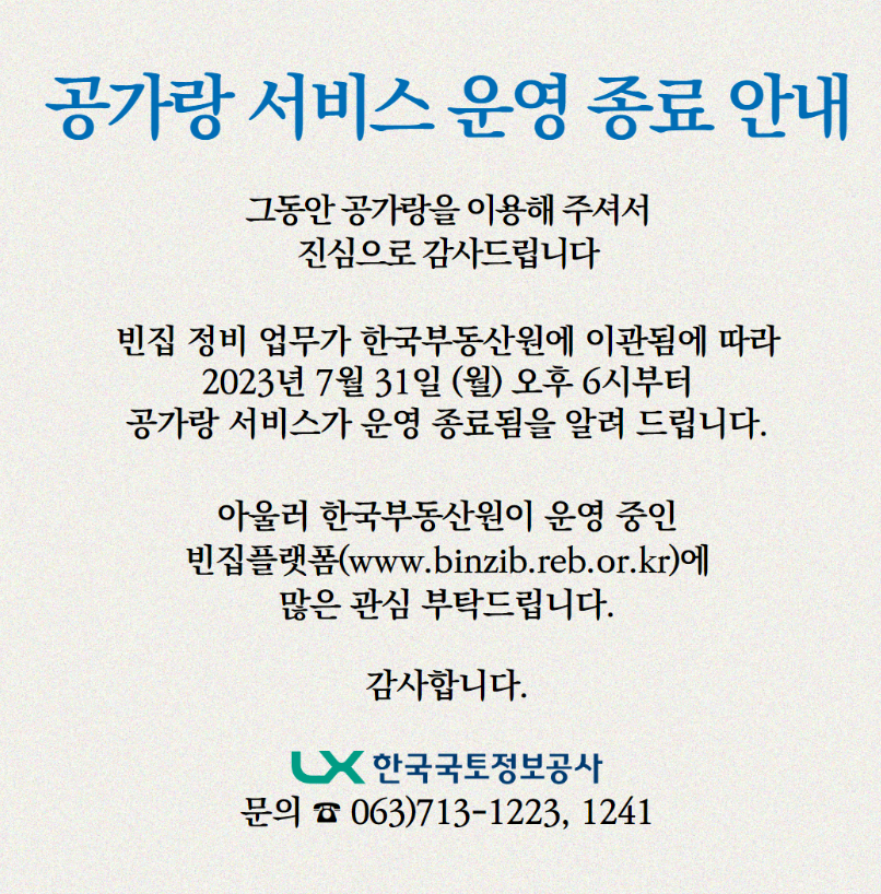 그 이유는 최근에 공가랑 업무가 한국 부동산원으로 이관되었기 때문입니다. 따라서 2023년 7월 31일부터 사이트 운영이 종료되었으며 이제는 새로운 빈집 플랫폼을 이용해야합니다.
