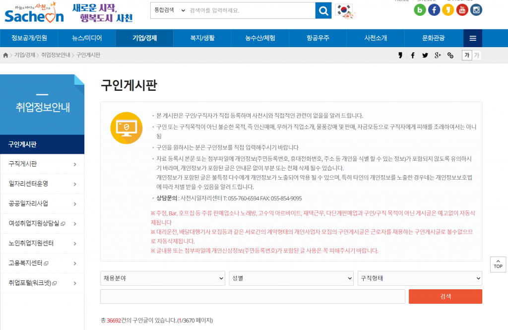 작은 시의 경우에는 시청에서 취업을 위한 일자리 정보를 제공하기도 합니다. 따라서 사천시청 홈페이지 -> 기업/경제 ->취업정보안내 -> 구인게시판에 접속하면 일자리를 찾아볼 수 있습니다. 거의 매일 공고가 올라오며 지속적으로 관리되고 있어서 유용합니다.