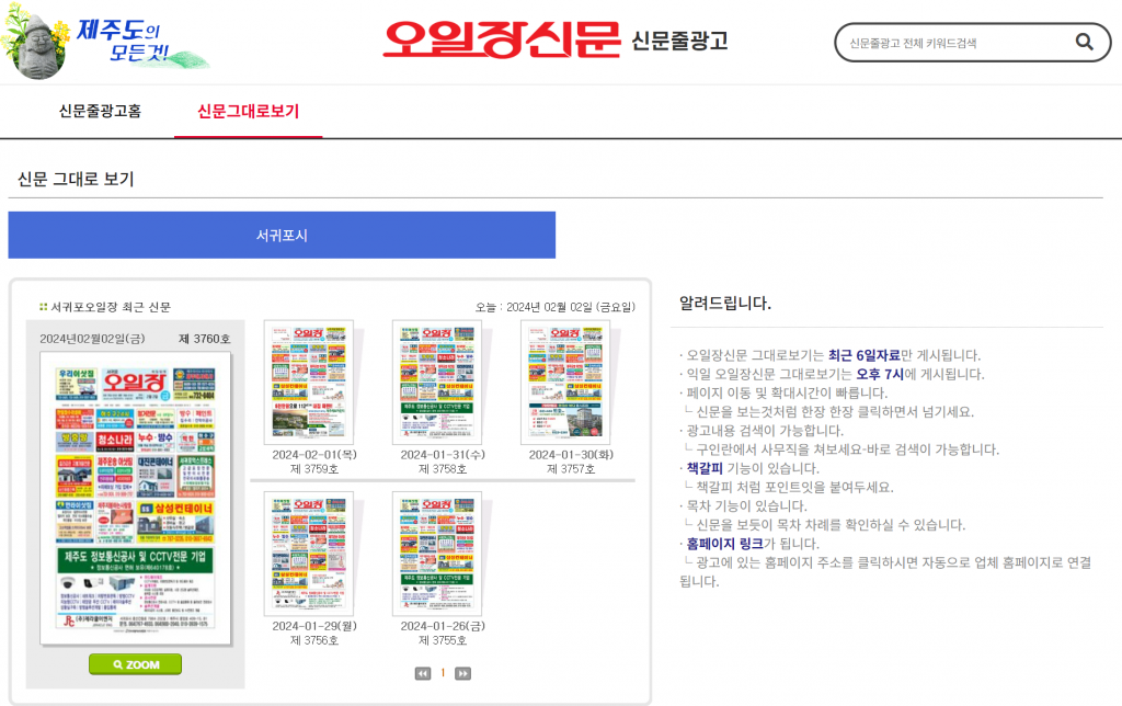 따라서 종이로는 이제 접할 수 없습니다. 하지만 인터넷으로 볼 수 있는 방법이 있습니다. '서귀포 오일장신문그대로보기' 서비스를 이용하면 네이버나 다음을 통해 해당 온라인으로 확인할 수 있습니다. 특히나 최근 홈페이지가 리뉴얼 오픈을 하면서 훨씬 깔끔한 화면을 볼 수 있습니다.