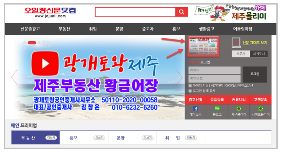 신문 그대로보기를 하기 위해서는 먼저 오일장 홈페이지에 접속해야합니다. 네이버나 다음과 같은 검색엔진을 통해 검색해서 접속해도 상관 없고, 또는 간편하게 위 링크를 통해 홈페이지로 바로 이동할 수 있습니다.