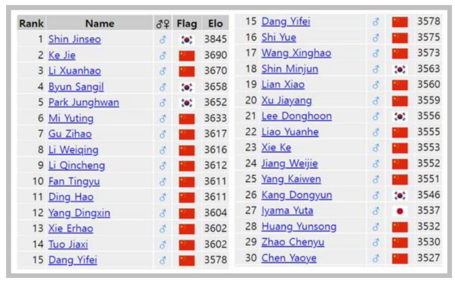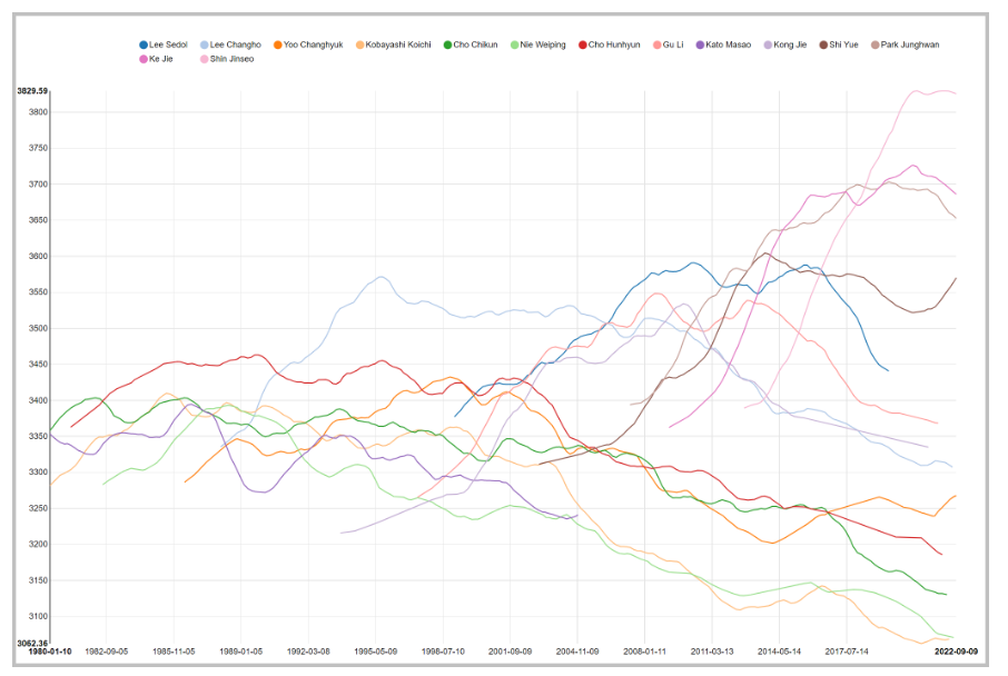 위 링크를 통해 고레이팅 사이트로 바로 이동할 수 있습니다. 세계 5위 안에는 한국인이 더 많지만 세계 20위 정도까지 보면 중국인이 압도적으로 많은 것을 확인할 수 있습니다. 어떤식으로 점수를 매기는 지는 명확하게 나와있지 않지만 과거 기력과 승패 횟수등을 종합적으로 고려한 WHR 알고리즘을 활용한다고 합니다.