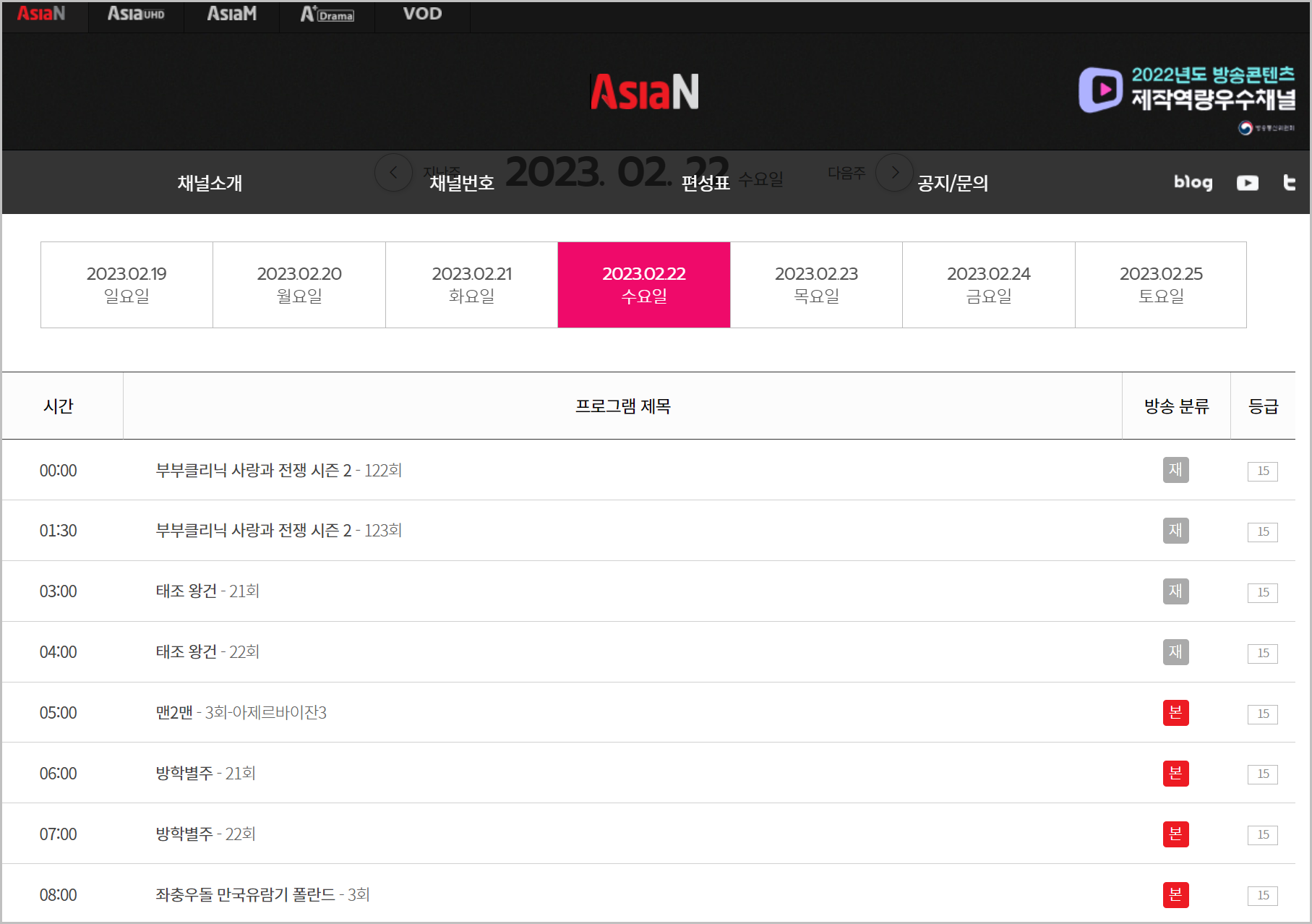 위 링크로 들어가시면 편리하게 공식 홈페이지로 들어가실 수 있습니다. 이곳에 들어가면 아래와 같이 편성표를 확인할 수 있습니다.