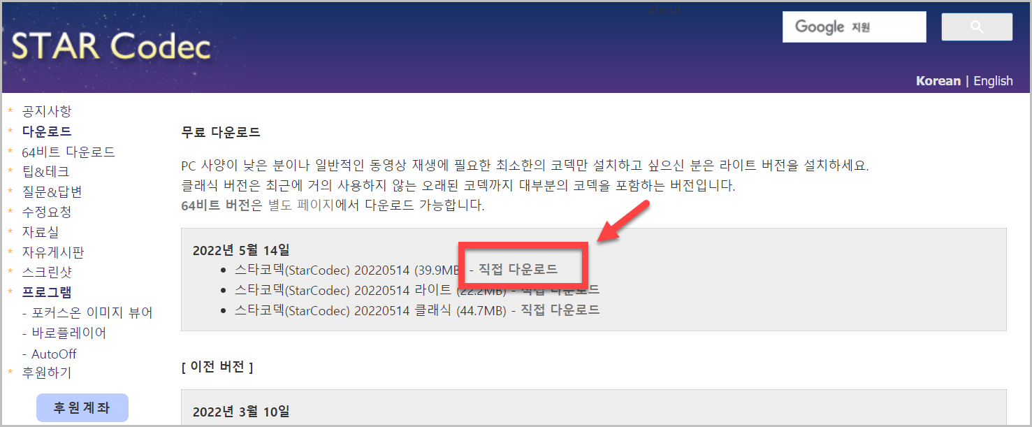 여기로 들어가시면 스타코덱으로 들어가실 수 있습니다. 요즘에는 코덱을 찾는 사람이 그렇게 많지 않음에도 불구하고 여전히 스타코덱 업데이트가 되고 있습니다. 코덱의 버전은 3가지가 있습니다.