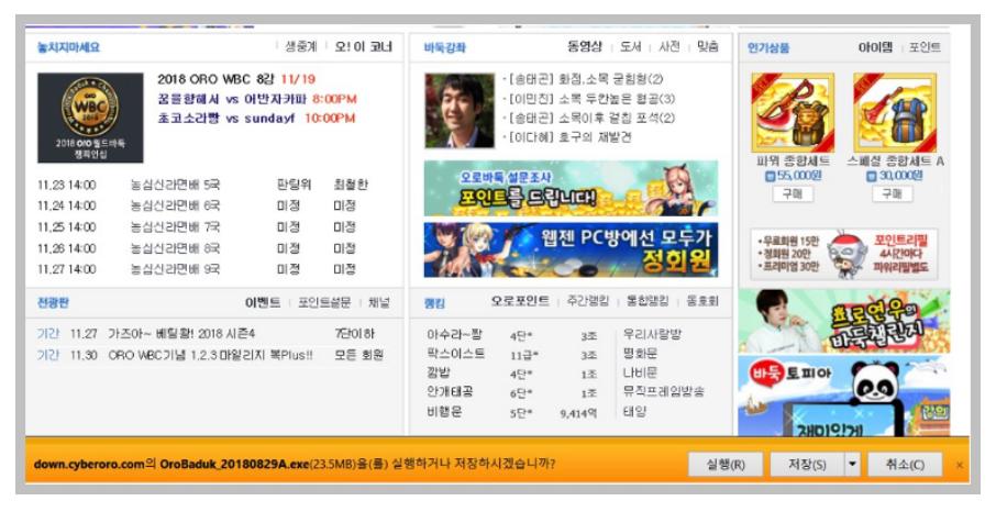 다운로드를 클릭한 이후, 화면 하단을 보면 오로바둑을 설치하거나 저장하겠냐는 안내창이 등장합니다. 여기서 실행을 클릭하면 바로 다운로드 한 이후에 게임을 플레이 할 수 있습니다.