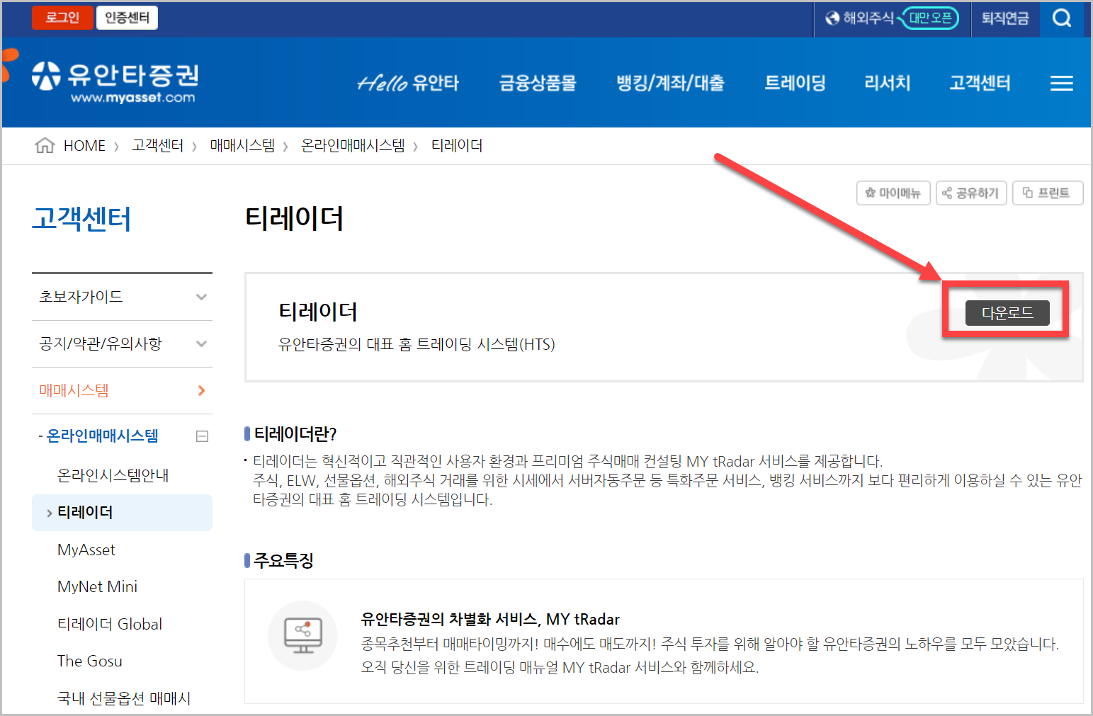 유안타 증권의 HTS는 TRadar입니다. 이것을 다운로드 하기위해 유안타 증권 홈페이지에 들어가면 TRadar를 찾기가 어렵습니다. 저와 같은 고생을 하실 그런분들을 위해서 제가 바로가는 링크를 올려두겠습니다. 아래 링크를 통해 웹페이지로 바로 이동할 수 있습니다.