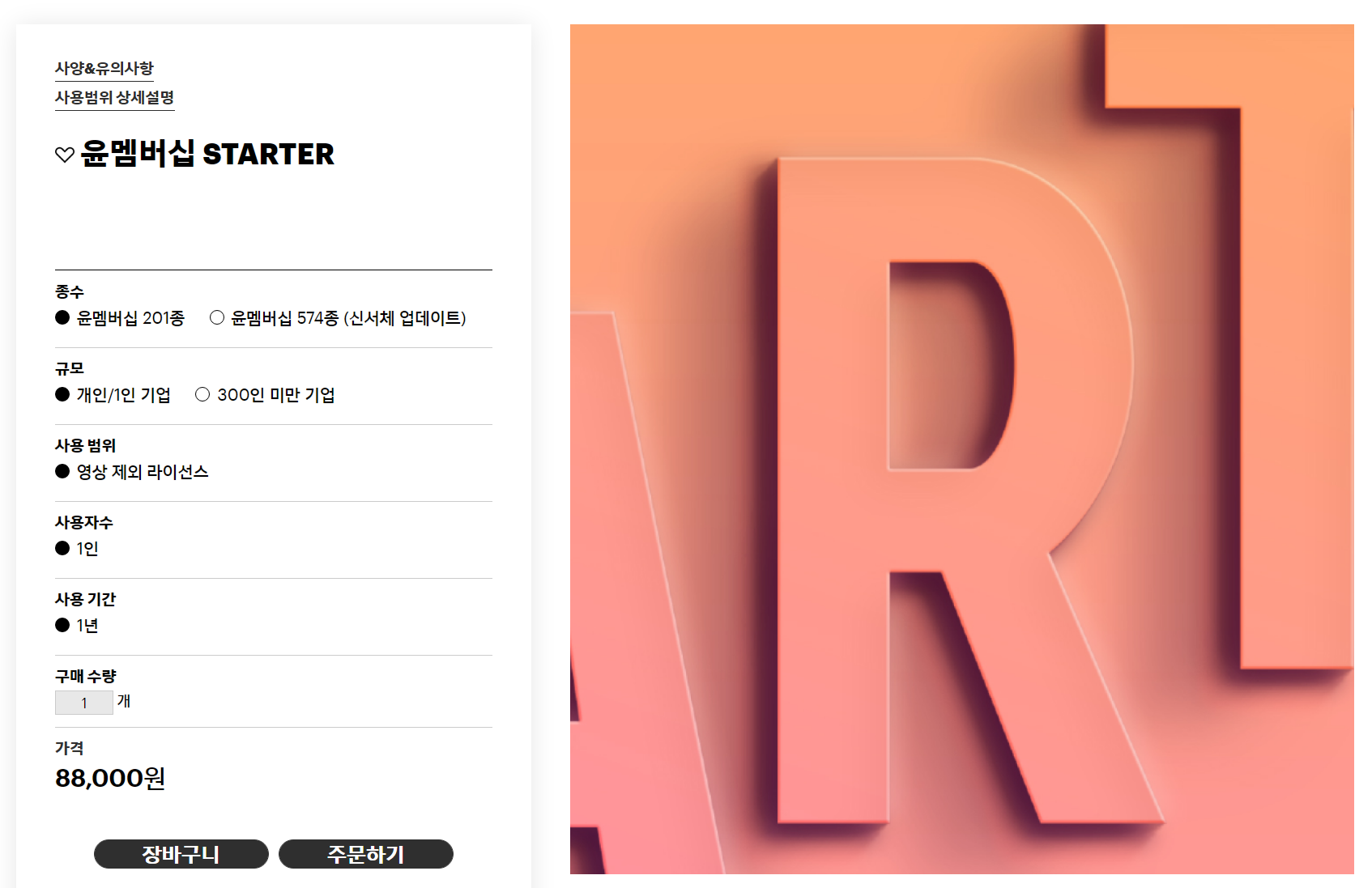 여기로 들어가시면 윤멤버십 STARTER를 구매할수 있습니다. 윤고딕을 포함한 다양한 폰트를 한번에 구매를 할 수 있습니다. 라이센스를 잘 살펴봐야하는데요, 영상을 제외한 저작권입니다. 만약 영상에 사용을 하기 위해서는 별도의 계약이 필요하다고 되어 있습니다.