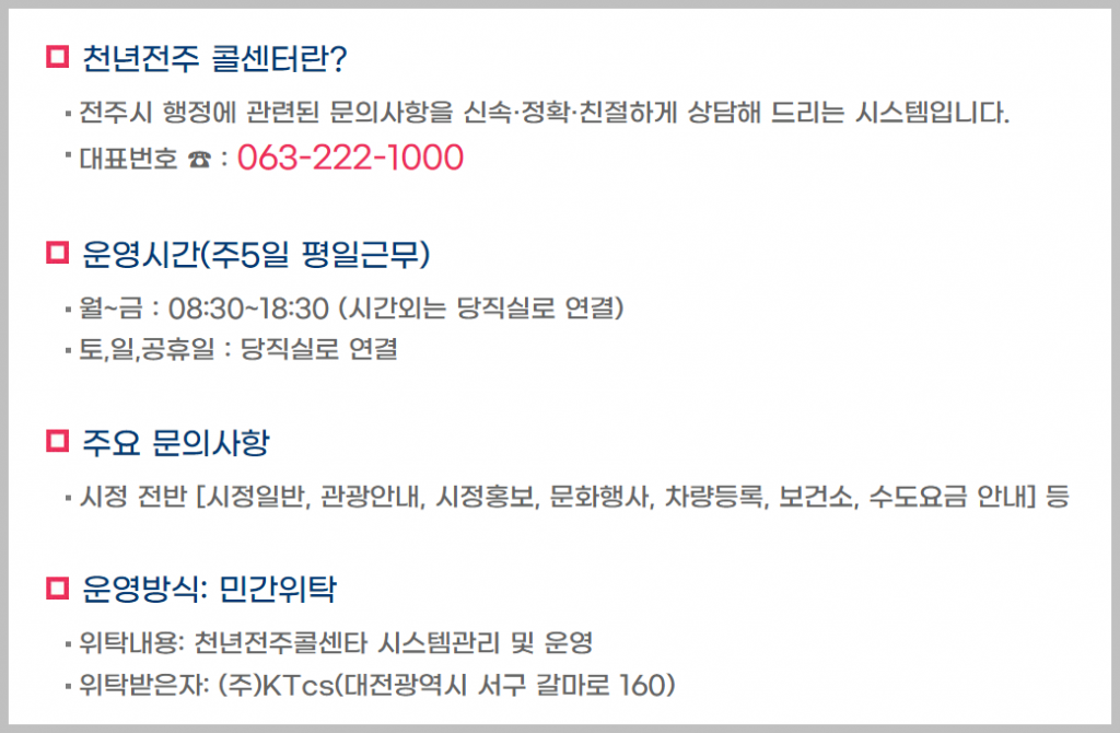 이곳은 위와 구조로 이뤄져 있습니다. 이는 전주시가 직접 운영하는 것이 아니라 위탁 운영되기 때문에 모든 정보를 제공받을 수는 없으며, 전문적인 답변이 필요한 경우 담당 부서로 연결됩니다. 하지만 대부분 간단한 것들은 답변을 받을 수 있습니다.
