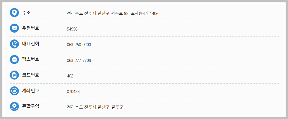 완산구와 완주군을 관할구역으로 두고있는 이곳은 설립 초기에는 재무서로 출발하였으나, 이후 전주세무서로 명칭이 변경되었습니다. 2008년부터는 효자동에 위치한 현청사로 이전하였습니다. 대표전화번호는 아래와 같습니다.