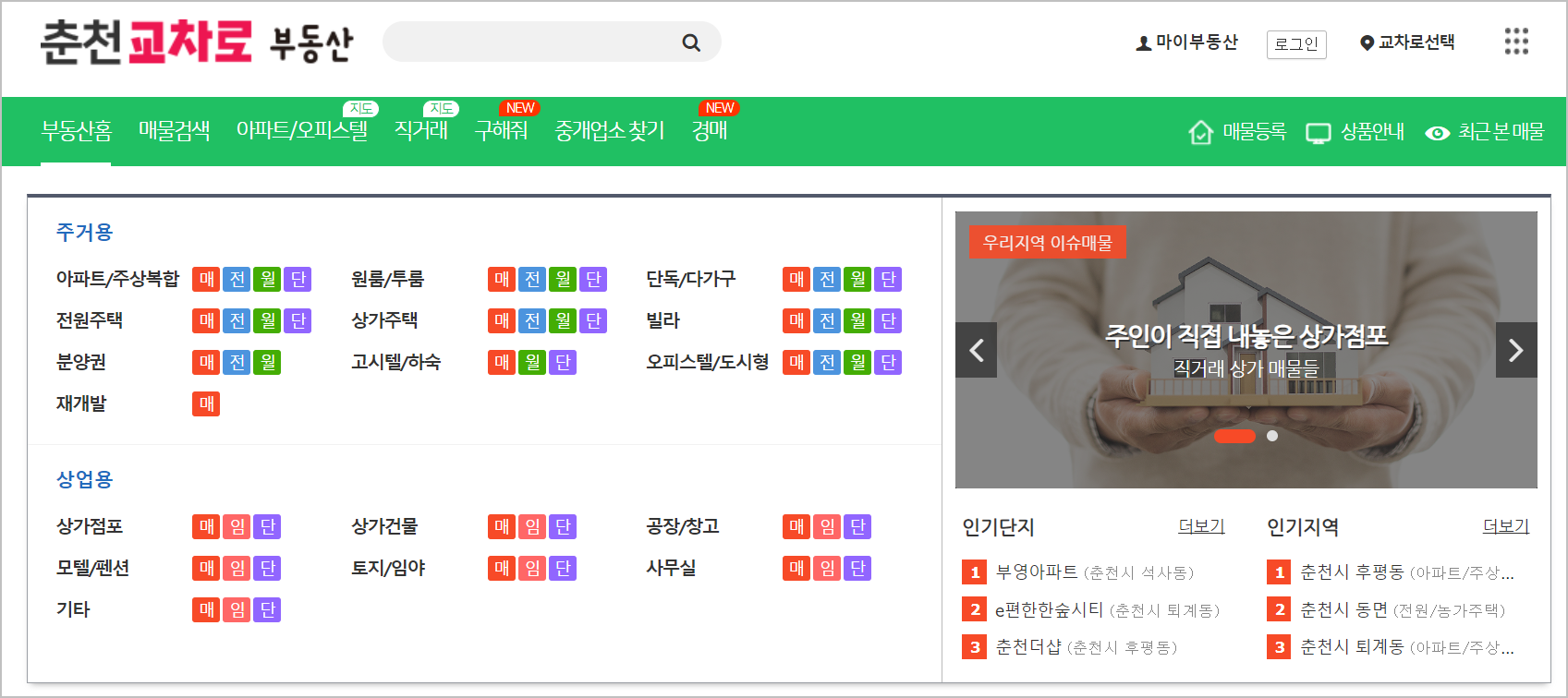 춘천교차로부동산 페이지로 가기위해서는 메뉴에서 화살표 부분을 클릭하시면됩니다. 그러면 아래와 같은 화면이 나오게 됩니다.