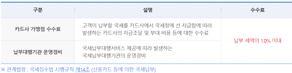 할부가 가능하다는 장점이 있지만 동시에 수수료가 있다는 단점이 존재합니다. 신용카드의 경우 가맹점 수수료등이 발생하기 때문에 이러한 수수료는 납세자가 부담해야합니다. 아래 수수료의 구성에 대한 설명사진을 첨부하도록 하겠습니다.
