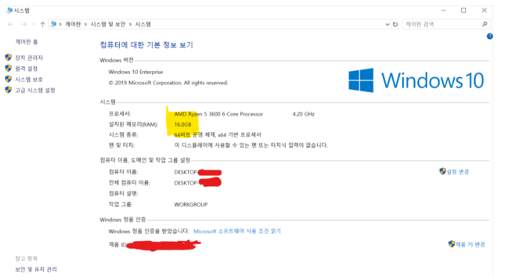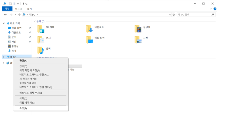 탐색기를 열어 '내 PC'를 우클릭하고 '속성'을 선택하면 아래와 같은 화면을 볼 수 있습니다.