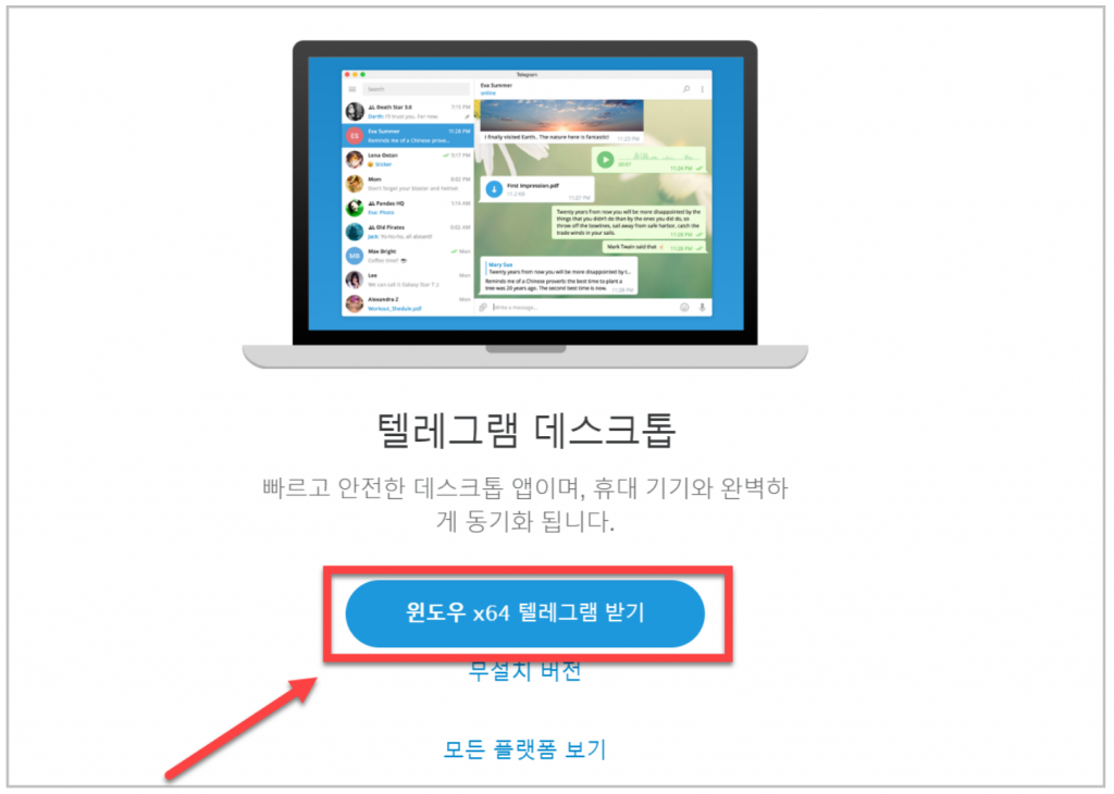 위 링크를 통해 공식 홈페이지에서 텔레그램 pc버전 다운로드 받을 수 있습니다. 노트북이나 데스크톱에 동기화할 수 있으며 무설치 버전도 있으니 참고하시길 바랍니다.