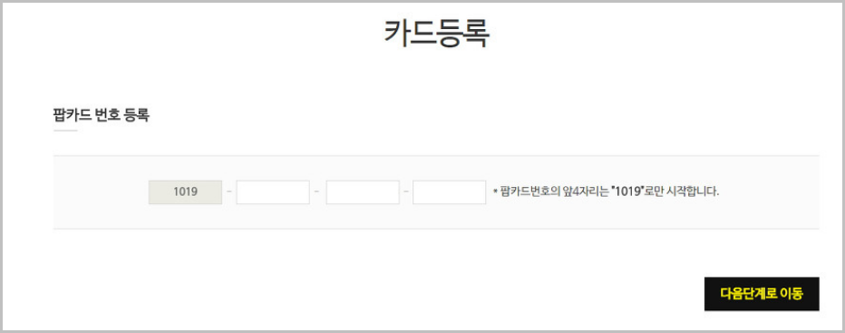 해당페이지가면 번호를 입력하도록 되어 있습니다. 팝카드 번호 최초 4자리는 1019로 시작하기 때문에 팝카드가 아닌경우에는 등록을 할 수가 없습니다.