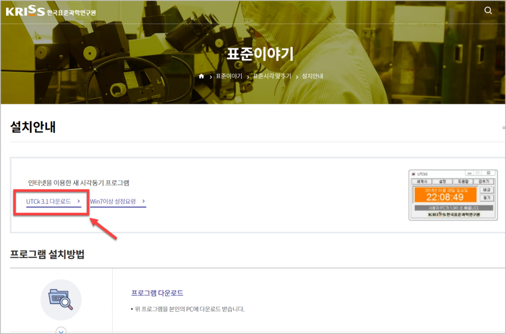 위 링크를 클릭하여 새시각동기 프로그램 (UTCk) 다운로드 페이지로 이동할 수 있습니다. 위와 같은 페이지에 접속하면 파일을 다운로드할 수 있습니다. 과정은 어렵지 않으며, 아래와 같은 순서로 진행됩니다.
