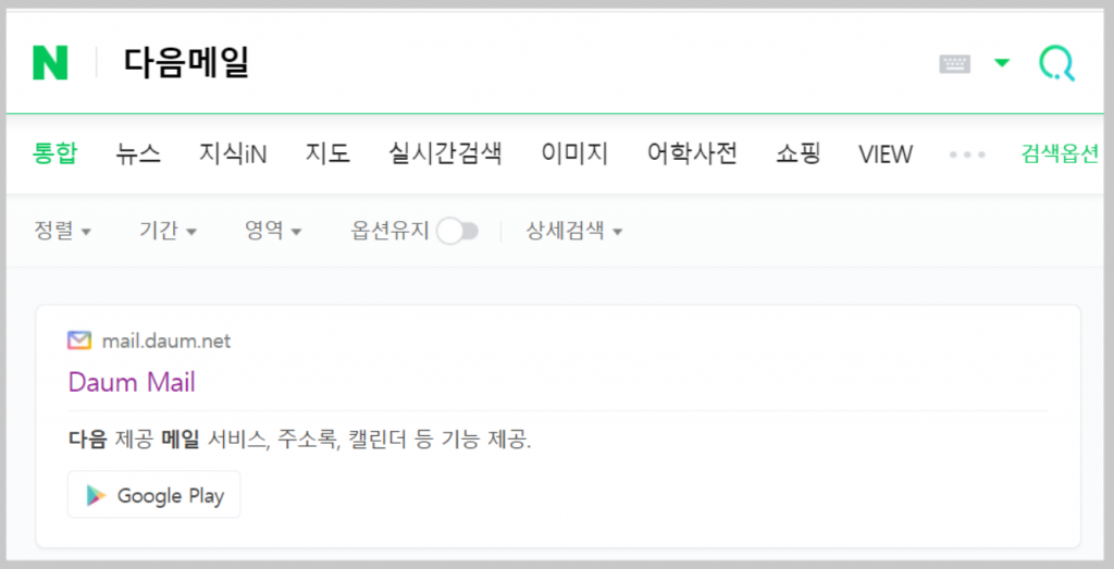 hanmail.net 홈페이지에 접속하려면 네이버나 다음과 같은 포털에서 위 사진과 같이 검색하고, 가장 상단에 있는 링크를 클릭하면 됩니다.