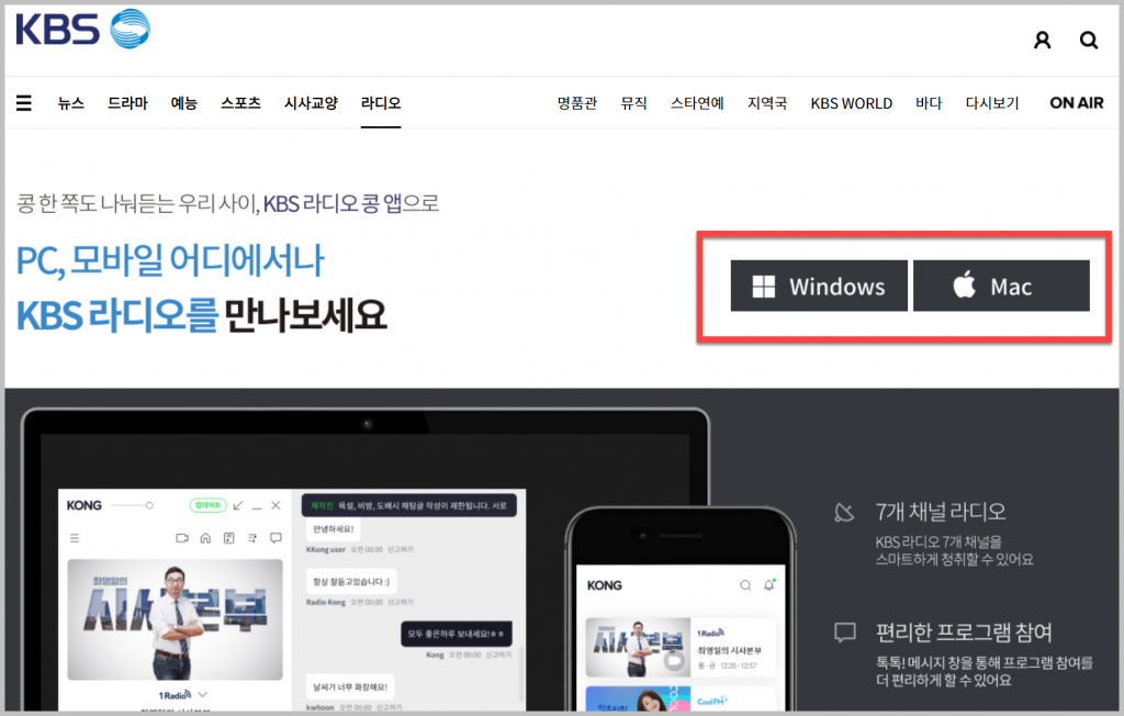 또한 한국방송공사는 뉴스와 문화 콘텐츠를 중심으로 폭넓은 분야에서 많은 사랑을 받고 있죠. 홈페이지에는 여러 서비스가 있는데, 그중 라디오 은 KBS의 인터넷 라디오 서비스로, 'KBS Online Network & Generation'(KONG)에서 이름을 따왔으며, 실시간 또는 다시듣기 서비스를 제공합니다.
