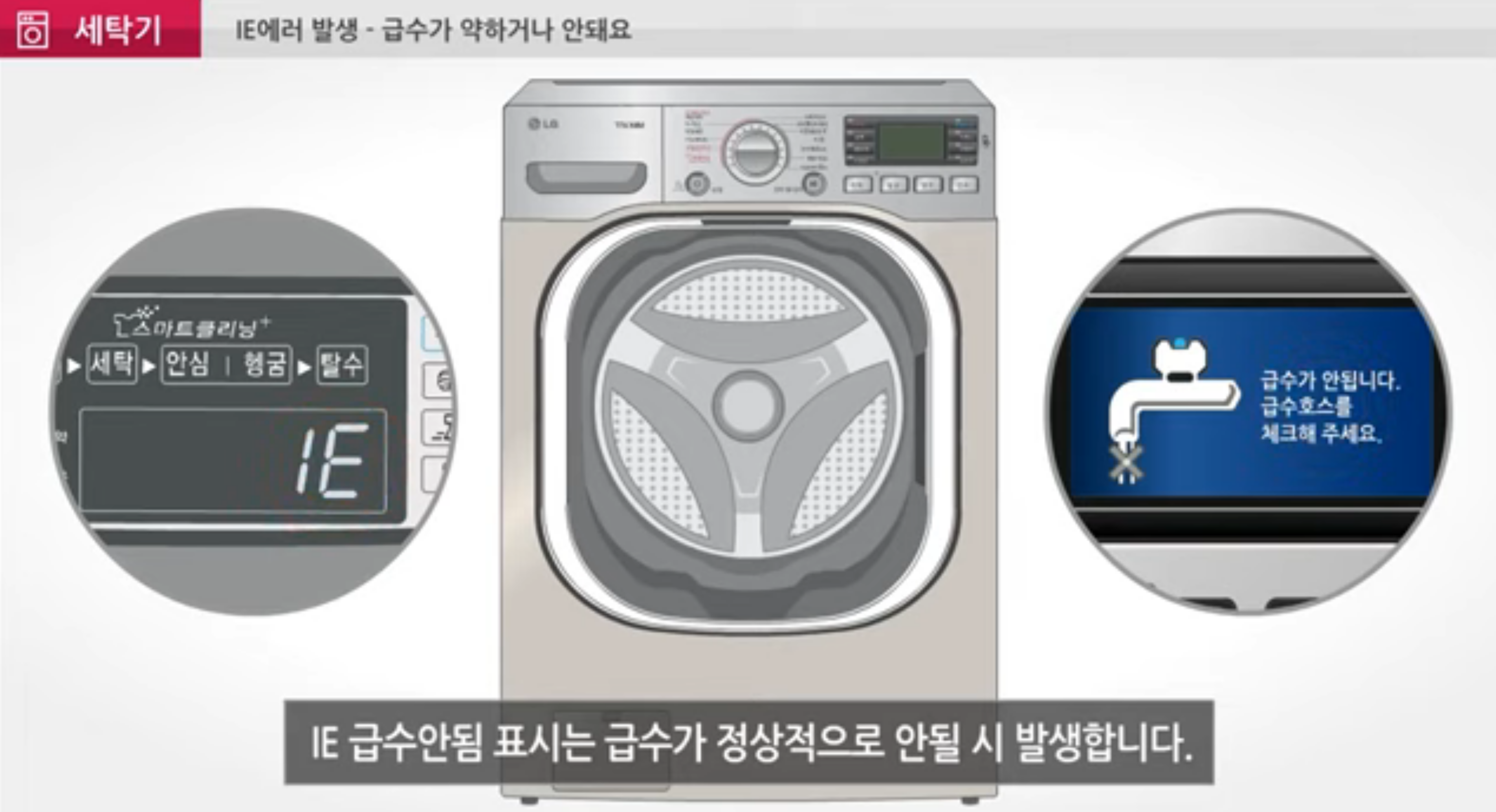 여러가지 문제로 LG세탁기 IE에러가 발생할 수 있습니다. 위의 내용으로 해결이 되지 않는다면, AS를 신청을 하길 권해드립니다.