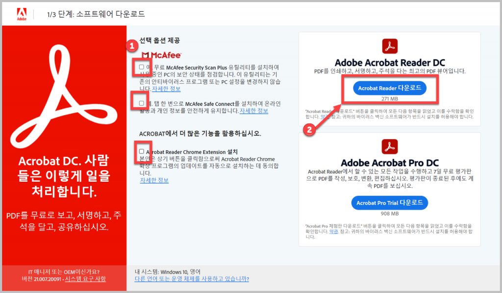 설치 시 불필요한 프로그램이 포함되지 않도록 주의해야 하며, 필요 없는 크롬 익스텐션은 체크해제해야 합니다. 우측 상단에서 아크로벳 리더 다운로드를 클릭하면 대략 270MB의 파일을 빠른 인터넷 속도로 1분 내에 설치할 수 있습니다. 편집 기능이 필요한 경우에는 Pro 버전을 사용할 수 있지만, 추가 비용이 발생합니다.