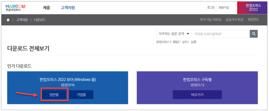 해당 페이지에서 2022 버전을 이용할 수 있고, 붉은 박스를 클릭하면 설치할 수 있는 팝업이 뜹니다. 이 파일을 설치하면 통합뷰어를 간단하게 설치할 수 있습니다.